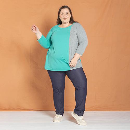 Remera de modal cuello redondo combinada en dos colores. Cuerpo en color, destacando un lateral y manga siempre en gris.