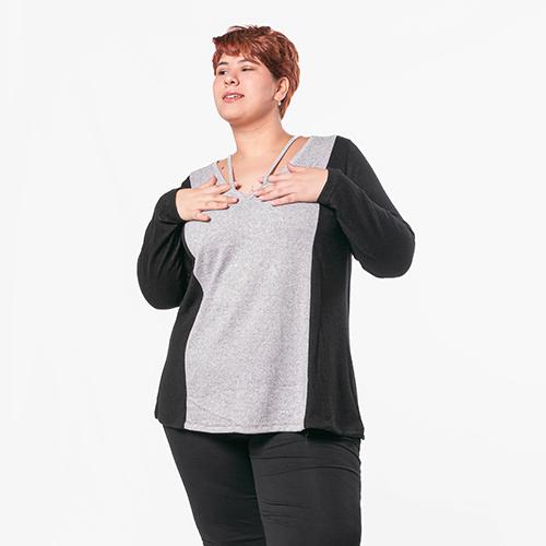 REMERON EN LANILLA A DOS COLORES, TIENE ESCOTE EN "V" CON DETALLE DE TIRA