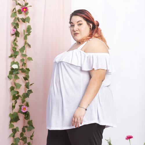 REMERA DE BUTONE CON VOLADO TIPO PAISANA. TIENE TIRAS CON DETALLE DE AROS