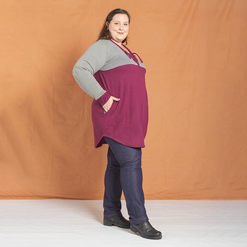 Remara de lannila combinada, con ojalillos en escote, manga larga y bolsillos laterales. Detalles en negro
