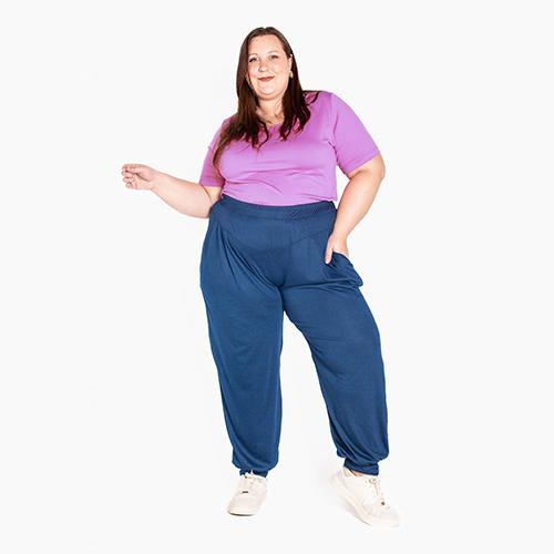 Esta babucha es de modal y tiene un recorte muy sentador en el delantero que estiliza la figura, su cintura ajusta con un elastico ancho, no se desliza hacia abajo ya que su tiro es alto. Posee bolsillos en los laterales. Sus piernas son bien sueltas y terminan en puno.