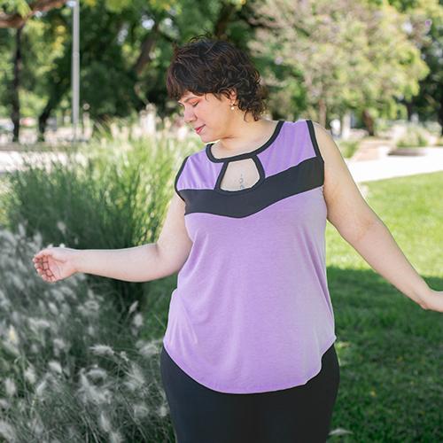 MUSCULOSA MUY MODERNA CON VIVOS EN NEGRO Y DETALLE DE FALTANTE EN EL DELANTERO.