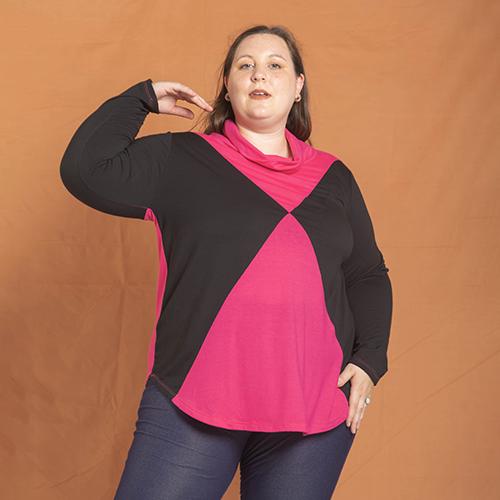 POLERON DE MODAL CON CUELLO SUELTO. TIENE COMBINACION DE TRIANGULOS EN DOS COLORES EN EL DELANTERO. ESPALDA EN MODAL NEGRO