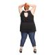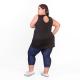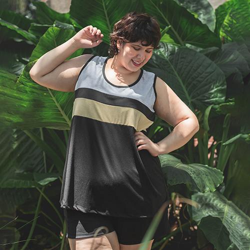 Remera sin mangas de linea evase en base negra y combinada con dos franjas de color. Tiene un detalle de eapalda descubierta,